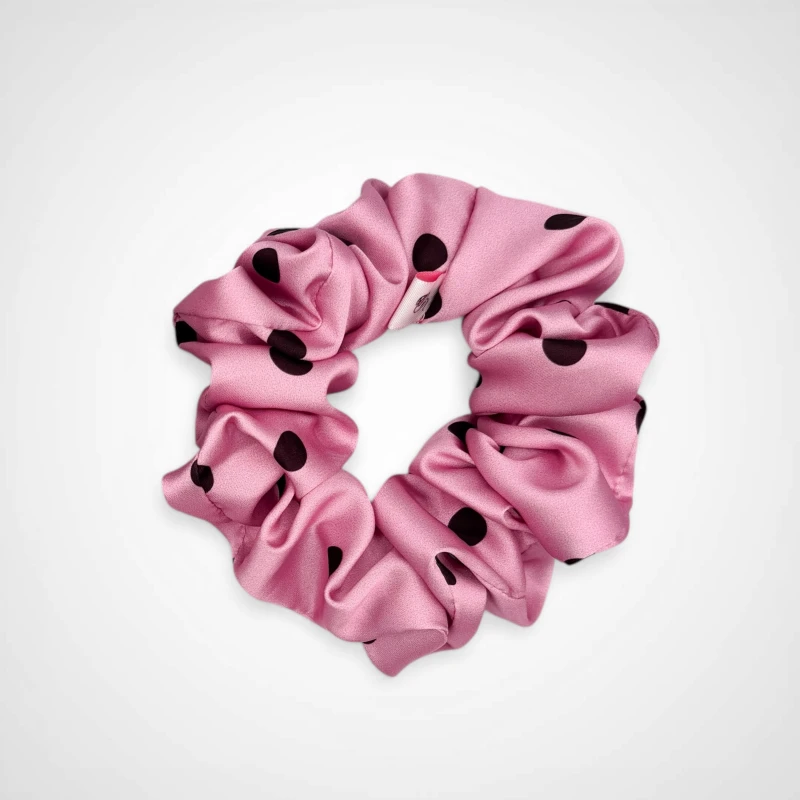 #różowa gumka do włosów #gumka w grochy różowa #gumka do włosów bordowe grochy #różowa gumka satynowa #gumka do kucyka różowa #scrunchie różowa w kropki