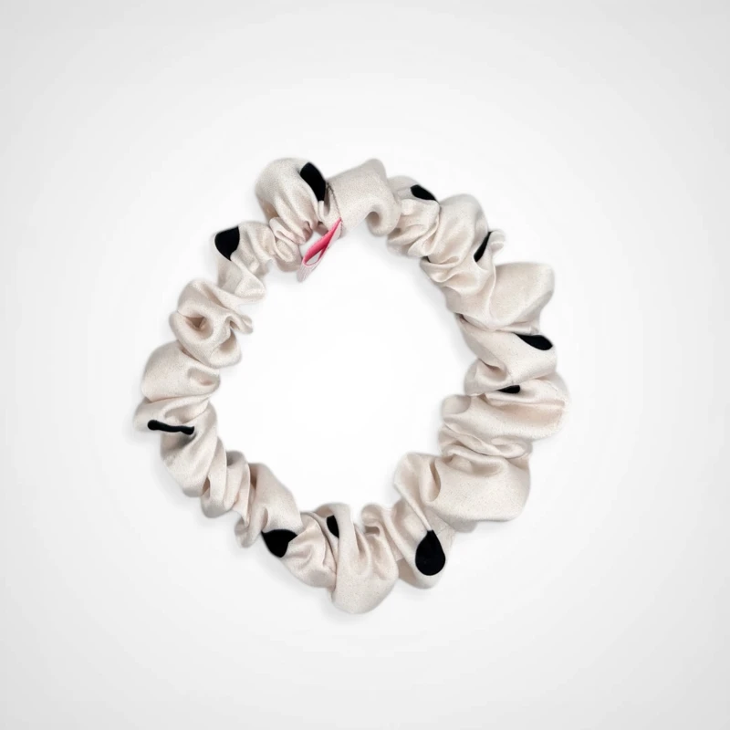 #kremowa gumka do włosów #beżowa gumka w grochy #gumka ecru czarne kropki #jasna scrunchie grochy #gumka do włosów kremowa #scrunchie beżowa w groszki #gumka retro grochy #gumka pin up ecru #gumka do koka kremowa #elegancka gumka do włosów jasna #gumka vintage grochy #gumka do włosów beż i czerń