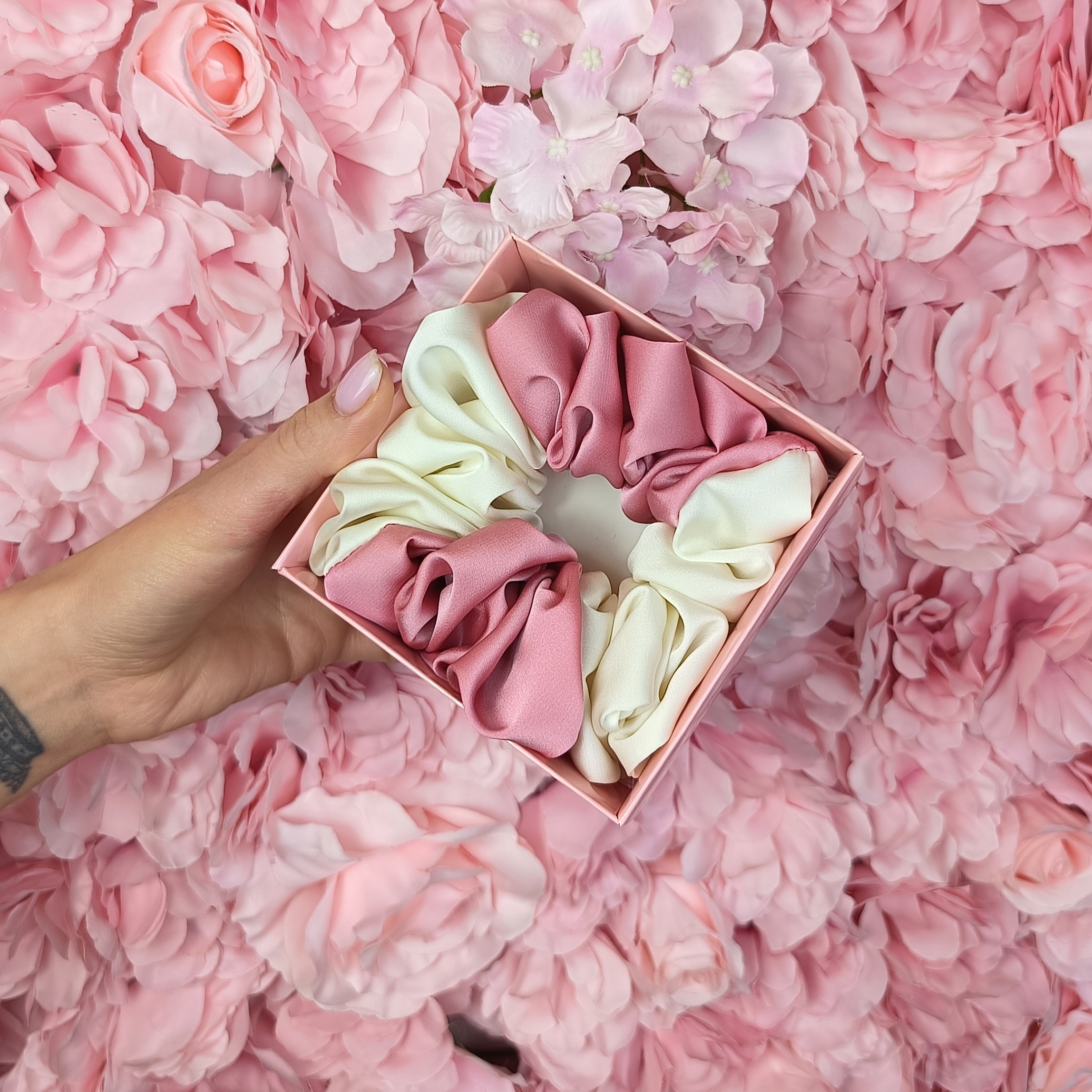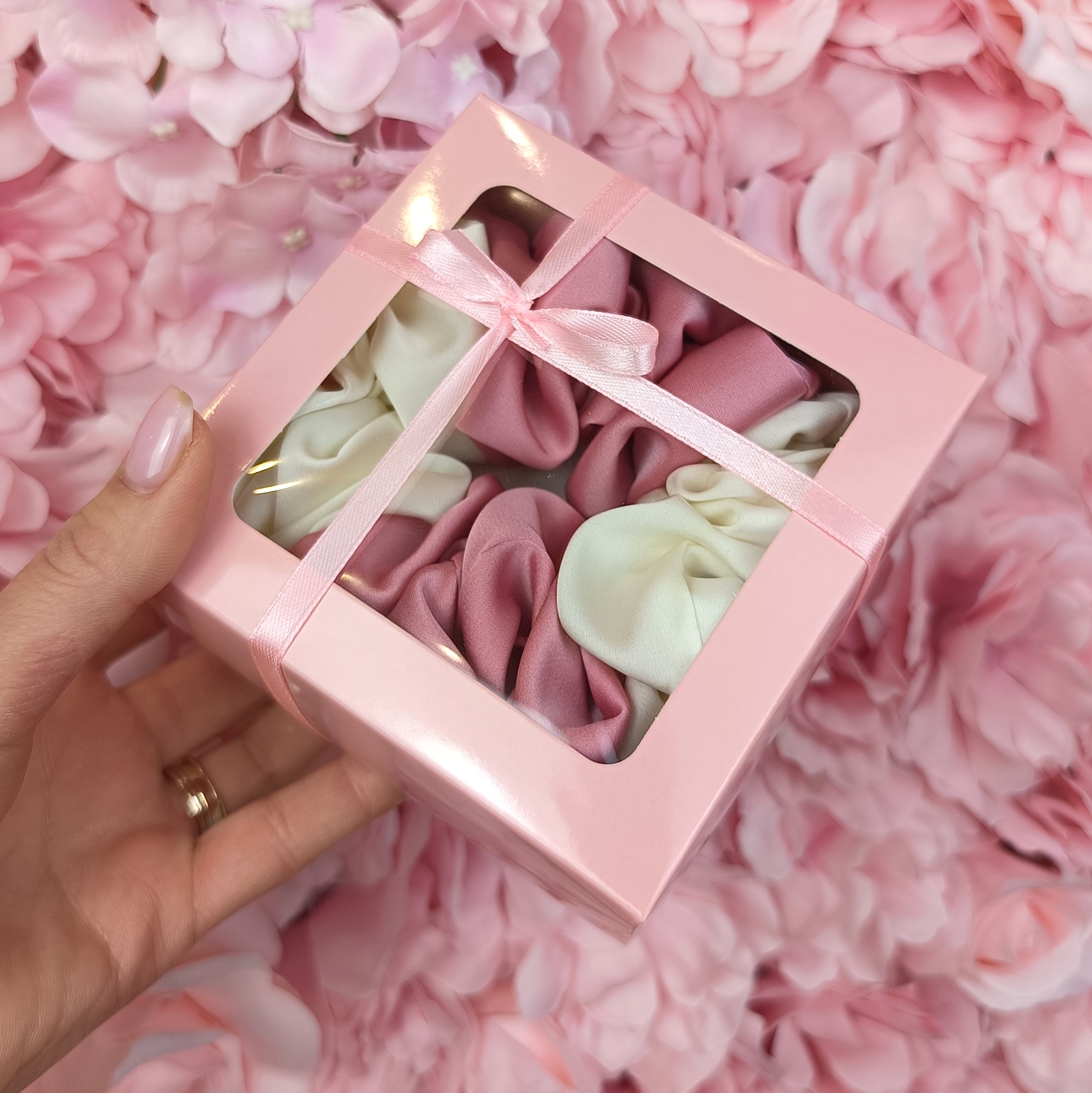 Unikalna, ręcznie wykonana scrunchie zapakowana w urocze różowe pudełeczko z kokardką, to doskonały drobiazg lub uroczy dodatek do prezentu.